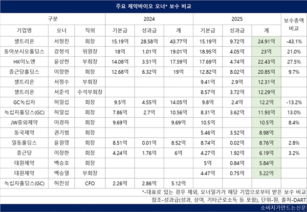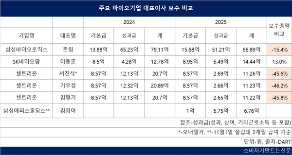셀트리온의 창업 2세 서진석 대표와 기우성, 김형기 대표도 보수총액이 11억 원대로 45% 이상 줄었다. 삼성바이오로직스와 셀트리온 대표 4인 모두 성과급이 10억 원가량 줄었다.