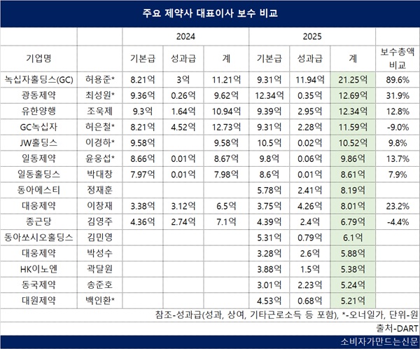 19일 소비자가만드는신문이 지주사를 포함한 국내 전통제약기업 16곳과 바이오기업 4곳의 대표이사 보수총액을 비교한 결과 제약기업 중에는 허용준 GC(녹십자홀딩스) 대표가 21억2500만 원으로 가장 많은 보수를 받았다. 허 대표는 증가율도 89.6%로 비교군 중 가장 컸다. 성과급이 11억9400만 원으로 4배 가까이 늘어났다.