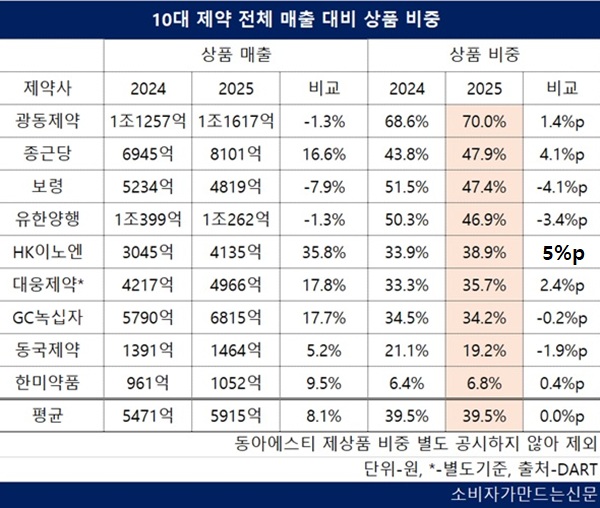 10대 제약사 절반 이상은 지난해 상품 매출 비중이 높아졌다.