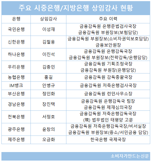 KB국민은행과 신한은행도 금감원 부원장보 출신인 이성재 감사와 김철웅 감사가 각각 올해 말까지 임기가 남아 있는 상황이다.