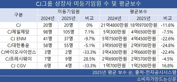 24일 전자공시시스템에 따르면 미등기 임원 평균 보수가 공시된 CJ그룹 상장사는 7곳이고 이중 6곳이 감소했다. CJ그룹 상장사는 9곳인데 CJ씨푸드(대표 임항순)는 사업보고서를 공시하지 않았고 스튜디오드래곤(대표 장경익)은 미등기 임원 평균 보수에 전임자 퇴직금이 포함돼 있어 제외했다.