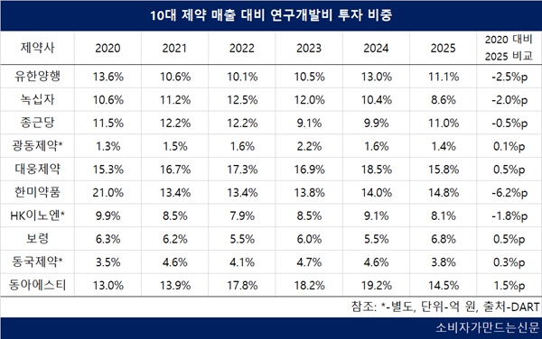 25일 전자공시시스템에 따르면 10대 제약사의 지난해 R&D 투자액은 평균 1363억 원으로 조사됐다. 2020년부터 살펴보면 2021년만 줄었고 나머지 해는 소폭이지만 매년 증가했다.