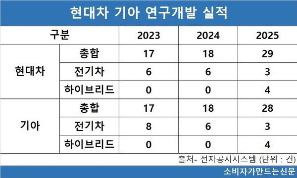 반면 전기차 관련 연구개발 실적은 급격히 줄었다. 2023년에는 현대차 6건, 기아 8건이었고 2024년 현대차 6건, 기아 6건을 기록했다. 지난해 현대차와 기아는 각각 3건으로 절반으로 줄었다.