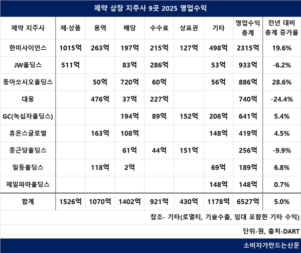 대웅(대표 윤재춘)과 휴온스글로벌(대표 송수영·윤성태), 일동홀딩스(대표 최규환)는 영업수익에서 용역이 차지하는 비중이 가장 크다.