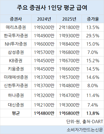메리츠증권(대표 장원재·김종민)은 2022년 이후 3년 만에 임직원 평균 급여가 2억 원을 넘어섰으며 한국투자증권(대표 김성환)은 지난해 임직원 평균 급여가 4400만 원 증가하며 가장 증가폭을 보였다.