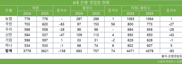 6대 은행 중에서 신한은행(행장 정상혁)의 점포당 생산성이 가장 높았고 생산성 상승폭도 가장 높았다. 하나은행(행장 이호성)과 농협은행(행장 강태영)은 점포를 늘렸음에도 생산성은 소폭 개선됐다. 하나은행은 2024년 생산성 1위에서 2위로 밀렸다.