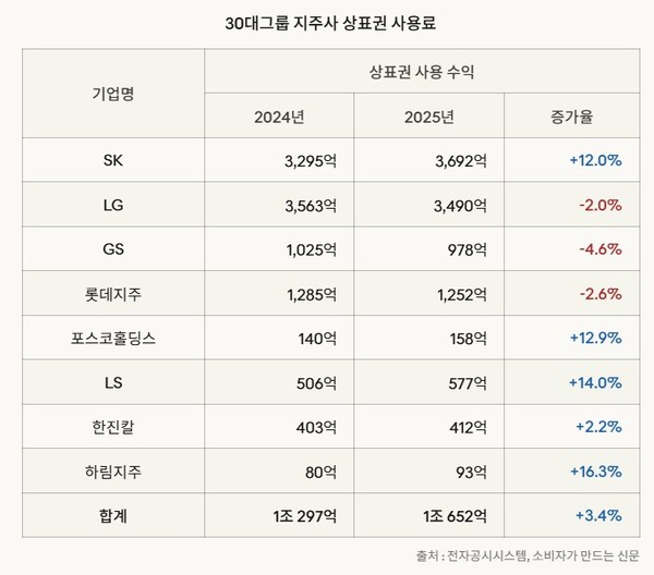 7일 전자공시시스템에 따르면 30대 그룹 지주사 중 상표권 사용료 내역을 공개한 8개사의 지난해 총 수익은 1조652억 원으로 3.4% 증가했다.