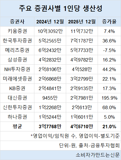 한편, 대신증권(대표 진승욱)은 지난해 영업이익이 4155억 원으로 전년 대비 202.4% 증가함에 힘입어 1인당 생산성이 전년보다 195.9% 증가한 2억7981만 원을 기록했다.