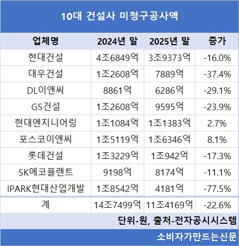 현대건설(대표 이한우)은 3조9373억 원으로 유일하게 미청구공사액 3조 원대를 기록했고 IPARK현대산업개발(대표 정경구)은 77.5% 감소세를 보였다. 미청구공사액이 증가한 곳은 포스코이앤씨(대표 송치영)와 현대엔지니어링(대표 주우정) 두 곳이다.