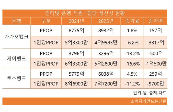 개별 은행 중에서는 토스뱅크(대표 이은미)의 직원 1인당 생산성이 7억7200만 원으로 가장 높았고 카카오뱅크(대표 윤호영)가 4억9983만 원으로 가장 낮았다. 직원 1인당 생산성은 각사의 충당금적립전영업이익(PPOP)을 직원 수로 나눈 값이다.