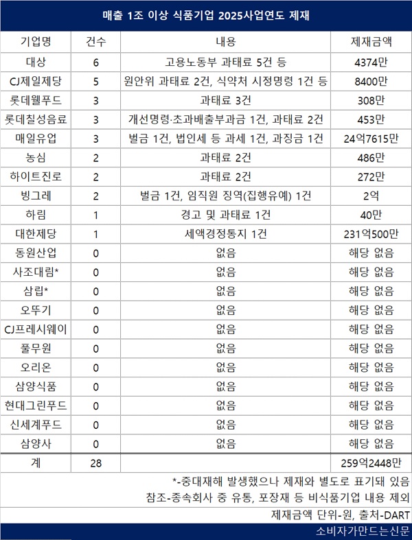 제재 건수는 대상(대표 임정배)이 지난해 6건으로 가장 많다.