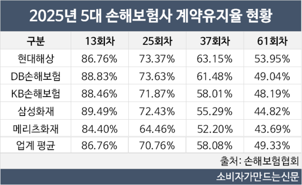 반면 메리츠화재는 1년차부터 5년차까지 유지율이 가장 낮은 것으로 나타났다.