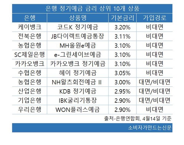 기본금리 기준 은행 정기예금(1년 만기) 금리 상위 10개 상품 중에서 대면 가입이 가능한 상품은 ▲농협은행 'NH왈츠회전예금Ⅱ' ▲산업은행 'KDB 정기예금' ▲기업은행 'IBK굴리기통장' 등 3개에 불과했다.