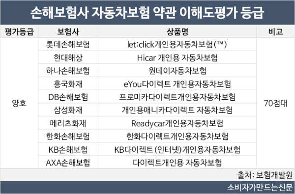 반면 손해보험사 10곳 중 '우수' 등급을 받은 곳은 없었다. 롯데손해보험, 현대해상, 하나손해보험, 흥국화재, DB손해보험, 삼성화재, 메리츠화재, 한화손해보험, KB손해보험, AXA손해보험 10곳 모두 70점대 평가점수를 받았다.