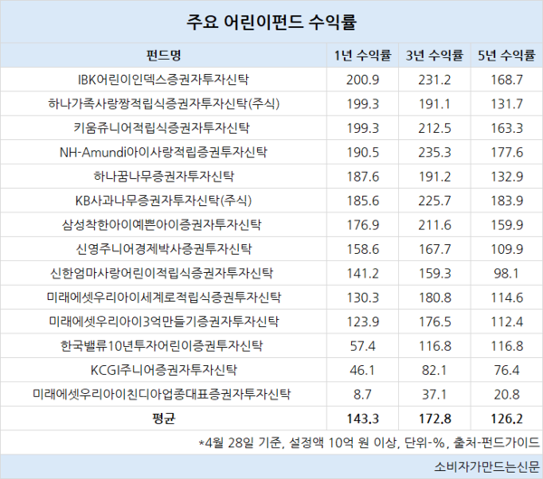 줄어드는 시장 규모와 달리 어린이펀드의 수익률은 호조를 보이고 있다. 설정액 10억 원 이상 어린이펀드 16개의 1년 평균 수익률은 28일 기준 143.3%로 나타났다. 3년 평균 수익률은 172.8%, 5년 평균 수익률은 126.2%였다.