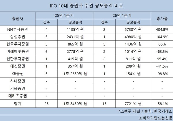 NH투자증권의 1분기 공모건수는 2건, 총액은 5730억 원으로 총액 기준 전년 동기 대비 404.8% 급증했다. 삼성증권도 같은 기간 공모총액이 104.9% 늘었다.