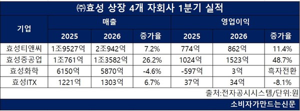 효성중공업(대표 우태희)은 영업이익 증가율이 50%에 육박한다. 효성티앤씨(대표 김치형)도 두 자릿수 비율로 증가했다. 효성화학(대표 이건종)은 흑자전환했다.