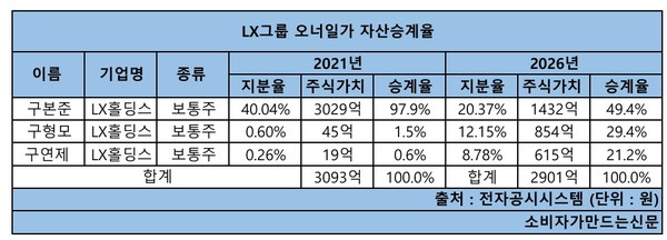 출범 직후인 2021년 12월 구본준 회장은 LX홀딩스 보유 지분 약 40% 중 11.81%를 아들인 구형모 사장에게 증여했다. 딸인 구연제 씨도 8.78% 지분을 증여 받았다. 증여 전 구 사장의 보유 지분은 0.08%에 불과했다.