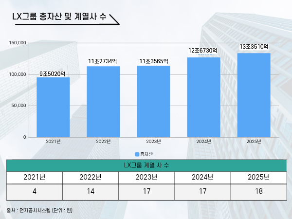 LX그룹 총자산은 LG그룹에서 분리하기 전인 9조5020억 원에서 지난해 말 기준 13조3510억 원으로 40.5% 늘었다.