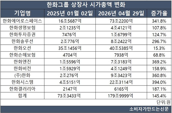 한화그룹은 상장사 시가총액도 눈에 띄게 커졌다. 29일 종가 기준 한화그룹 시가총액은 179조9999억 원으로 지난해 1월 초 대비 145.4% 증가했다. 시가총액 역시 재계 5위권이다.