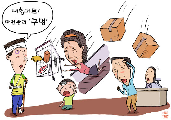 머리 위로 박스가 떨어져 뇌진탕을 당하고 경사진 매장 입구에서 카트와 함께 미끄러지거나 무빙워크에서 카트가 뒤집어져 아이가 크게 다치는 사고도 발생해 보다 안전한 매장관리가 시급하다는 지적이다.