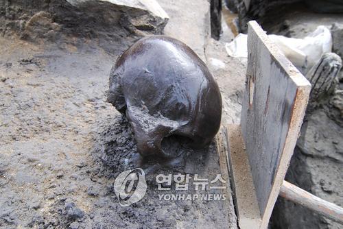 조사단은 "수로 윗면에서 발견한 이 인골은 머리와 얼굴 부분이 또렷이 남아있으나 다른 신체 부위는 발견되지 않았다"고 말했다.(연합뉴스)