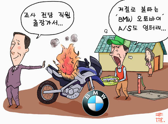 BMW에서 제조 판매하는 오토바이에서 전선합선으로 추정되는 불이 났지만 보름이 넘도록 조사 중이라는 이유로 아무 처리를 해주지 않아 소비자가 분통을 터트리고 있다.