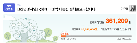 인터넷 포털사이트 ‘다음’ 아고라에 개설된 이명박 대통령 탄핵 청원 서명 수가 36만 명을 넘어섰다.