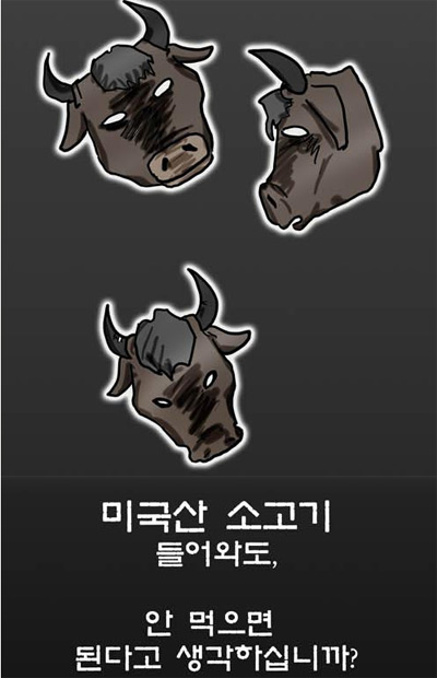 미국 쇠고기 수입을 반대하는 여론이 확산되며 인터넷을 중심으로 서명운동과 집회, 시위가 진행되고 있는 가운데 따듯한 이야기 '순정만화' '바보'등으로 유명한 인터넷 만화가 강풀씨가 만화를 통해서 미국 쇠고기 수입을 비판하고 나서 화제다.