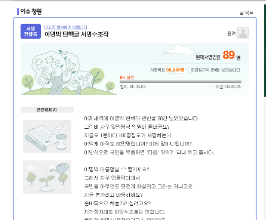 하지만 일부 네티즌들은 ‘이명박 탄핵 글 서명수 조작’ 이라는 제목으로 서명을 진행하며 “서명수가 조작되고 있다.”는 의혹을 제기하고 있어 눈길을 끈다.