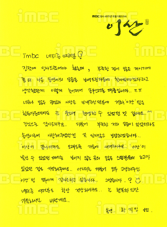 한지민은 30일 '이산' 홈페이지에 "네티즌 여러분, 진작에 인사드렸어야 했는데 부족한 점이 많은 저이기에 좀 더 나은 송연이의 모습을 보여드린 다음에 찾아뵈어야겠다고 생각했던 게 이렇게 늦어져서 송구스러울 따름"이라고 감사의 마음을 전했다.
