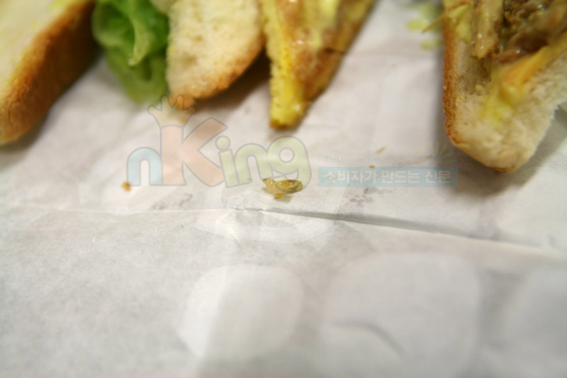 직원 넷이서 둘러 앉아 샌드위치를 반쪽씩 나눠 먹던 중, 신씨는 닭고기와 소스가 버무려진 내용물에서 구더기처럼 생긴 벌레가 고개를 빳빳이 들고 스멀스멀 기어나오는 것을 발견했다.