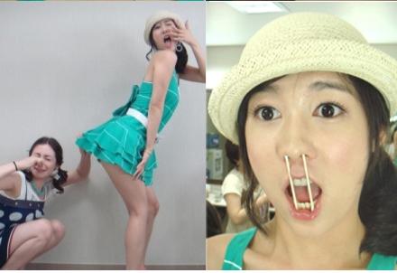 사유리는 지난 15일 자신의 미니홈피에 하늘색 원피스를 입고 입술에 집게를 집거나 코에 면봉을 꽂고 있는등 엽기적인 사진들을 올렸다. 또 '미녀들의 수다' 다른 멤버인 아비가일이 사유리 치마를 들어올리며 코를 막고 있는 사진도 눈길을 끌고 있다.