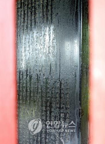 실제 이 비석은 1894년 갑오경장 7일전 62ℓ의 땀을 처음 흘린뒤 1910년 경술합방, 1919년 3.1운동을 비롯해 6.25전쟁, 5.16쿠데타 등 국가 중대사가 있을 때마다 땀을 흘렸다는 기록이 있으며 최근에는 제17대 대통령선거가 끝난 직후인 지난해 12월28일 3ℓ의 땀을 흘린 것으로 기록돼 있다. (연합뉴스)