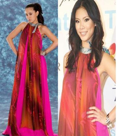 전통의상은 통굽 신발과, 허리춤에 차고 있던 검, 흰색과 빨간색이 주를 이루는 의상의 색깔 등이 일본 기모노 같다는 지적을 받았고, 이번 대회 이브닝 드레스도 지난해 미스 유니버스 일본 참가자 모리 리요가 입은 옷과 흡사하다는 의견이 잇따르고 있다.