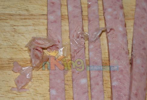 김밥 재료로 쓰기위해 햄을 적당한 크기로 손질하려 하는데 잘 썰리지 않아 칼에 힘을 주자 햄이 뚝 끊어졌고 그 속에 기다란 비닐이 뭉쳐 있었다. 겉보기에는 비닐 장갑이 섞여 들어간 듯 했다.