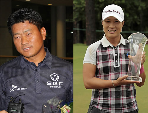 최경주(40)가 박세리(33)의 미국여자프로골프(LPGA) 투어 벨 마이크로클래식에서 우승을 축하했다.