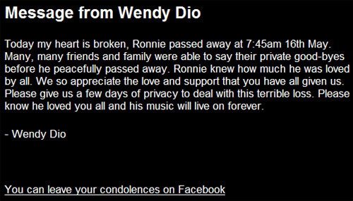 디오의 부인인 웬디는 “로니가 5월 16일 오전 7시 45분 사망했다. 친구들과 가족이 지켜보는 가운데 편안히 눈을 감았다”며 “로니는 여러분의 사랑을 잘 알고 있다. 대신 감사를 전한다. 그의 음악을 기억해달라”고 전했다.