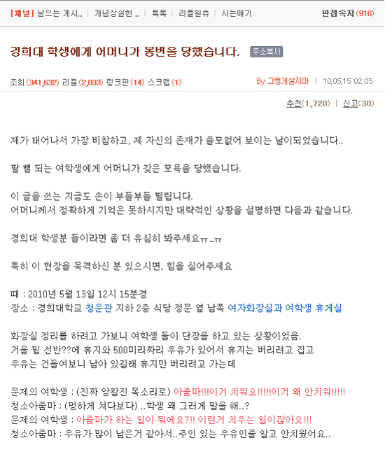 지난 15일 네이트 게시판에 '경희대 학생에게 어머니가 봉변을 당했습니다'라는 제목의 글이 올라왔다.