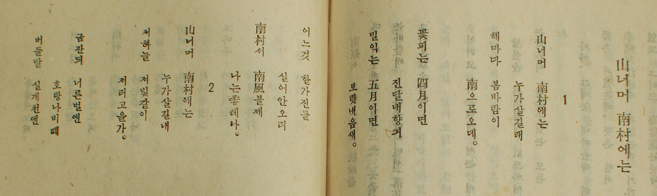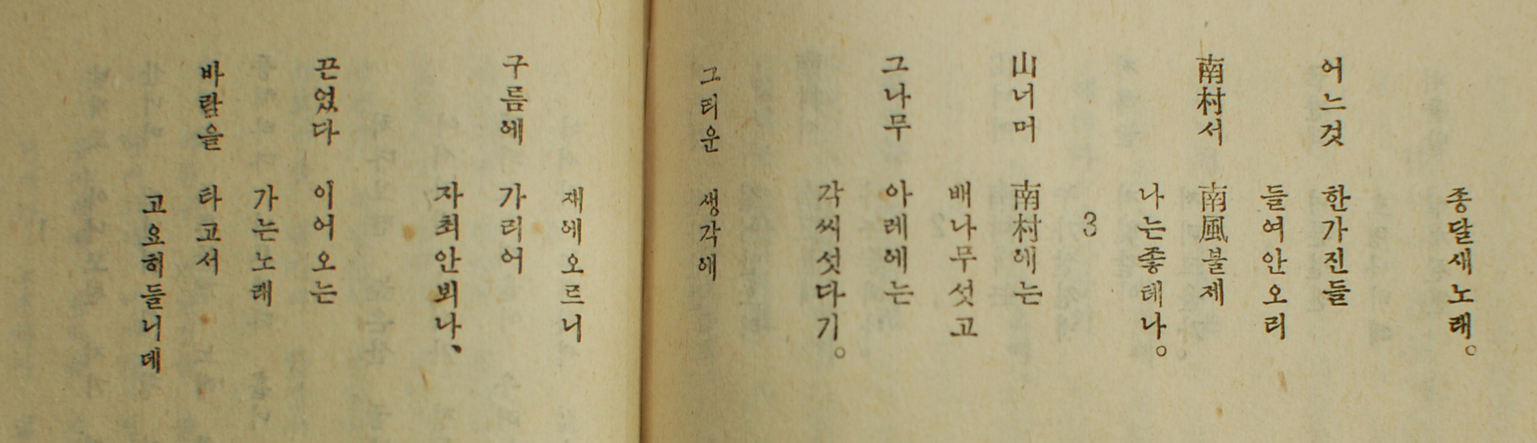 다만, 3절의 경우는 원본시와 다소 차이가 큰데, 원본시의 3절은 다음과 같다. [<산너머 남촌에는> 원본 사진 1,2 참조. 김동환 서정시집 <해당화> (대동아사 출간, 1942)에 수록된 것.]