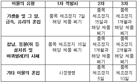 식약청 관계자는 "그동안 인체에 위해할 수 있는 이물이 식품에 혼입됐더라도 처음 적발됐을 경우엔 '시정명령'을 내렸다.하지만 관련 행정처분을 강화해 같은 일이 반복되지 않도록 해야 한다는 지적이 제기됨에 따라 이를 개선.보완한 법을 시행할 계획"이라고 해명했다.