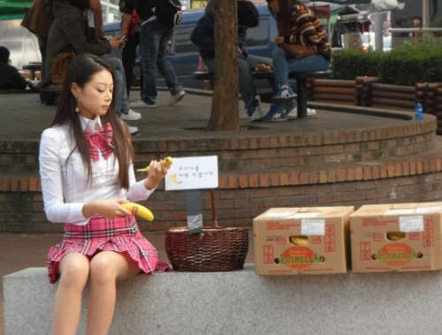 지난 20일 홍대와 명동거리에 ‘바나나녀’가 모습을 드러냈지만 네티즌들의 싸늘한 눈길을 받고 있다.