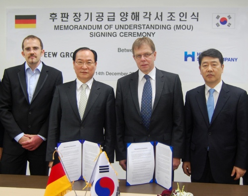 현대제철은 지난 14일 말레이시아 조호르바루(Johor Baharu)에 위치한 후육강관업체 EEW-Malaysia 본사에서 박승하 부회장과 EEW그룹 쿠어트 라이쇼우(Kurt Reichow) 사장이 참석한 가운데 해양구조용 후판 공급과 관련한 MOU를 체결하고 연간 20만톤의 물량을 공급키로 했다고 15일 밝혔다.