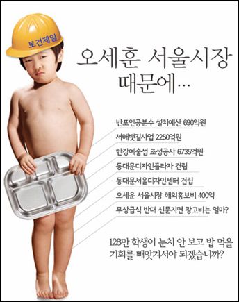 서울시는 지난 21일 주요 일간지에 무상급식 반대 광고를 실어 네티즌들로부터 원성을 샀다. 서울시가 실은 광고는 '인상을 쓰고 있는' 벌거벗은 한 아이가 식판으로 중요한 부위를 가리고 있는 사진으로 "전면 무상급식 때문에 128만 학생이 안전한 학교를 누릴 기회를 빼앗아서야 되겠습니까"라는 내용을 담고 있다.