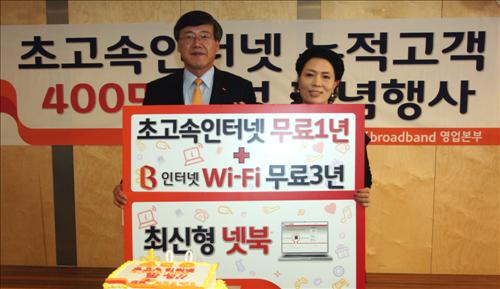 SK브로드밴드는 이날 오전 본사에서 박인식 사장과 임직원이 참석한 가운데 초고속인터넷 400만번째 가입 고객을 초청, B-WiFi 3년 무료 이용권과 초고속인터넷 1년 무료권, 넷북 등을 기념품으로 전달하는 행사를 가졌다.