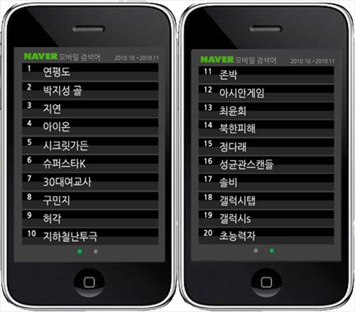 NHN(사장 김상헌)이 운영하는 네이버(www.naver.com)는 다양한 검색 기능이 제공되는 ‘네이버 앱’ 출시 이후 2개월 간(10월, 11월) 모바일 이용 트래픽을 분석한 결과 이용자들이 가장 많이 찾은 검색어로 '연평도'가 뽑혔다고 22일 밝혔다. 2위는 '박지성골'이 차지했다.