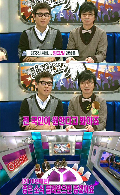 MC진은 김국진이 러브라인이 형성될 때마다 예민한 반응을 보이는 것에 대해 "농담인데도 여자 얘기가 나오면 너무 질색한다","농담도 화제가 되는 걸 보면 김국진 씨의 핑크빛 만남을 전 국민이 원한다고 봐야 한다"며 "2011년에는 좋은 소식 들려왔으면 좋겠다"라고 말했다.