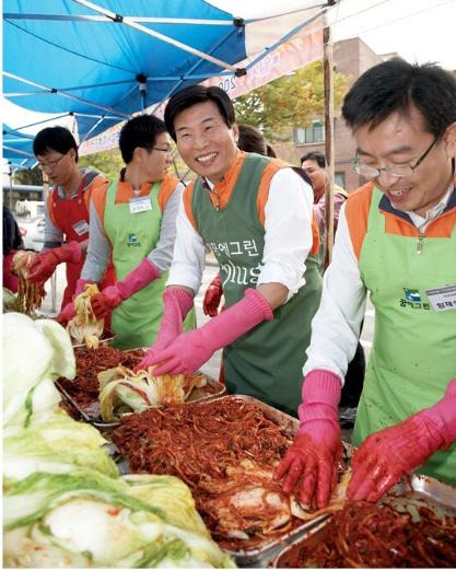 ▲한화건설 임직원들이 ‘사랑의 김장담그기’ 봉사활동에 참여하고 있다.