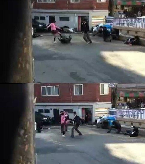 동영상에는 분홍색 후드티를 입은 한 여학생이 7명의 남학생들과 격투를 벌이며 순식간에 제압하는 모습이 담겨있다.