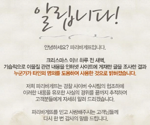 파리바게뜨는 24일 홈페이지 팝업창을 통해 이번 '쥐식빵' 논란을 야기한 사진이 타인의 명의를 도용한 것으로 나타났다고 밝혔다.